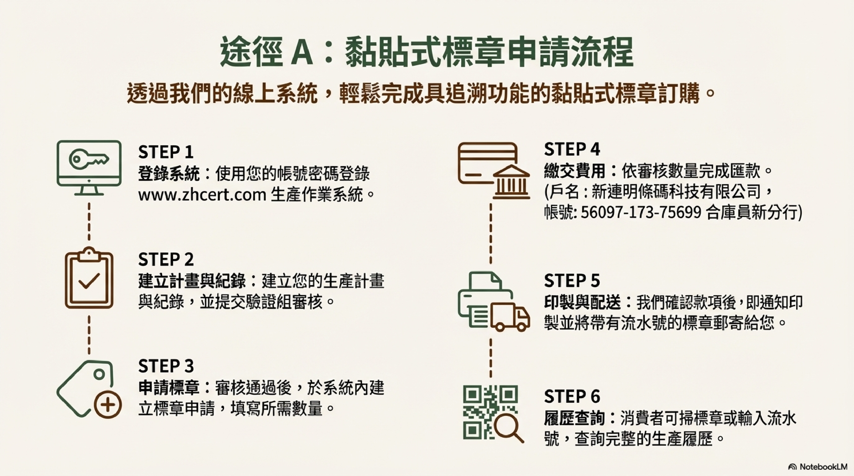 - 申請數量 → 繳費 → 驗證單位通知印製廠出貨