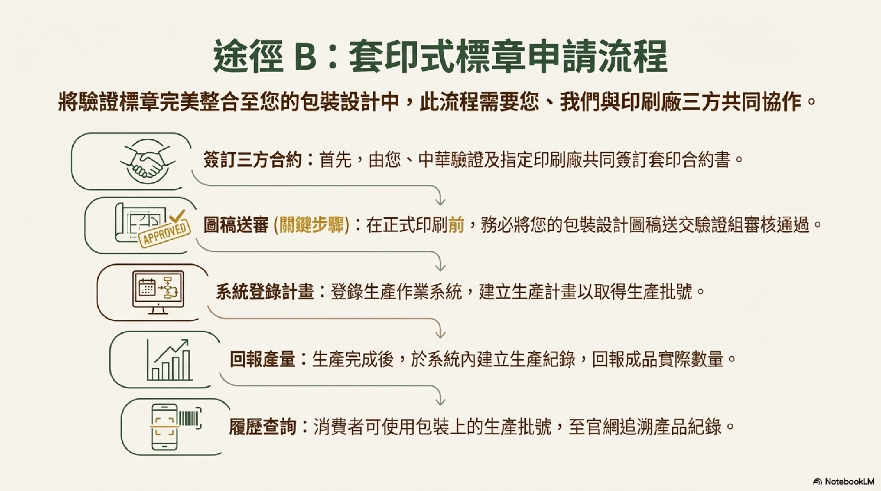 - 圖稿審核 → 系統登記 → 核准後方可印刷